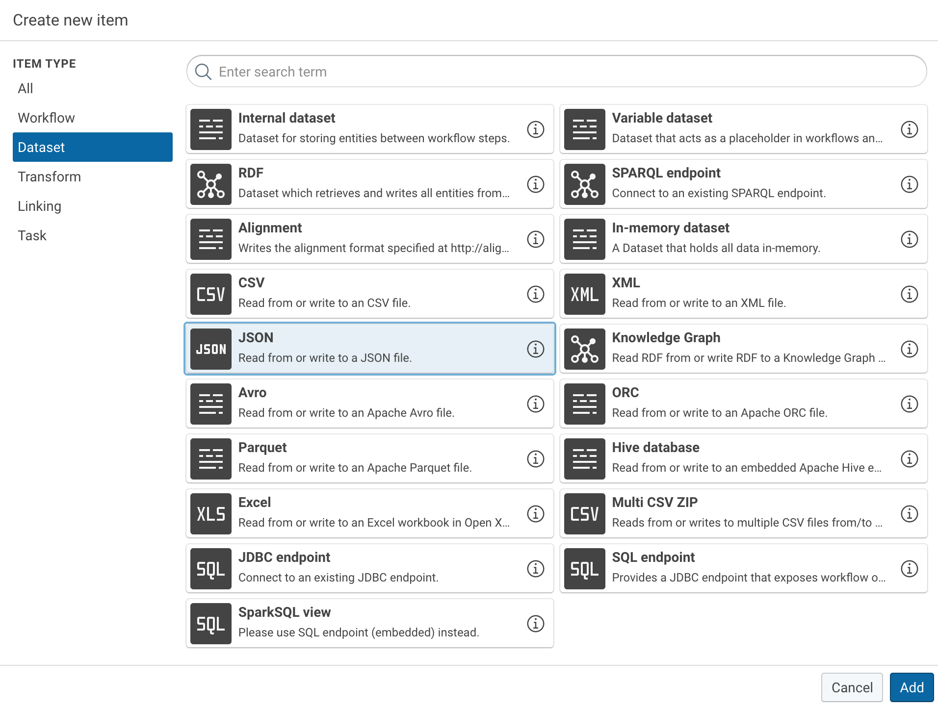 A dataset represents an abstraction over raw data. In order to work with data, you have to make it available in the form of a dataset. A dataset provides a source or destination for the different kinds of tasks. I.e., it may be used to read entities for transformation or linking, and it can be used to write transformed entities and generated links.
