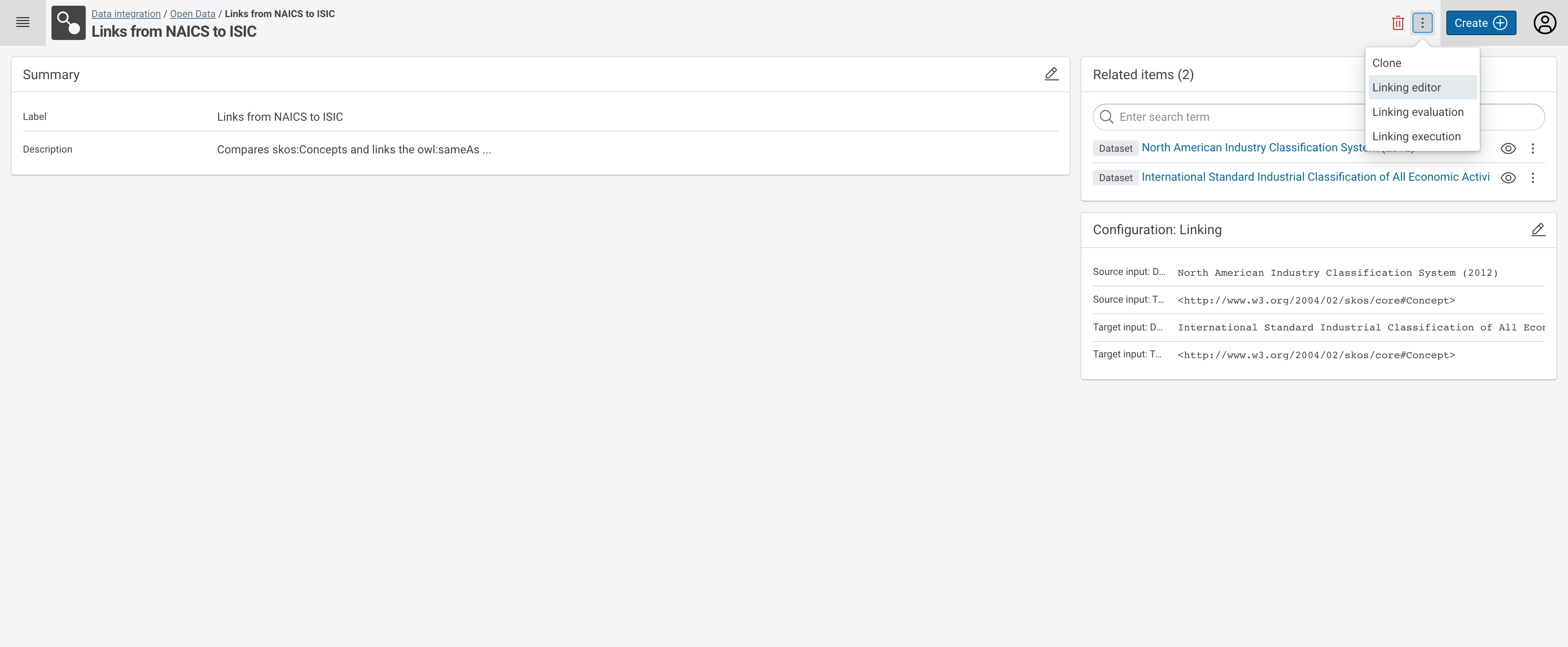 - Linking tasks compare entities from two datasets according to (hierarchical) sets of comparators and generate links between these datasets in an output (link) dataset.