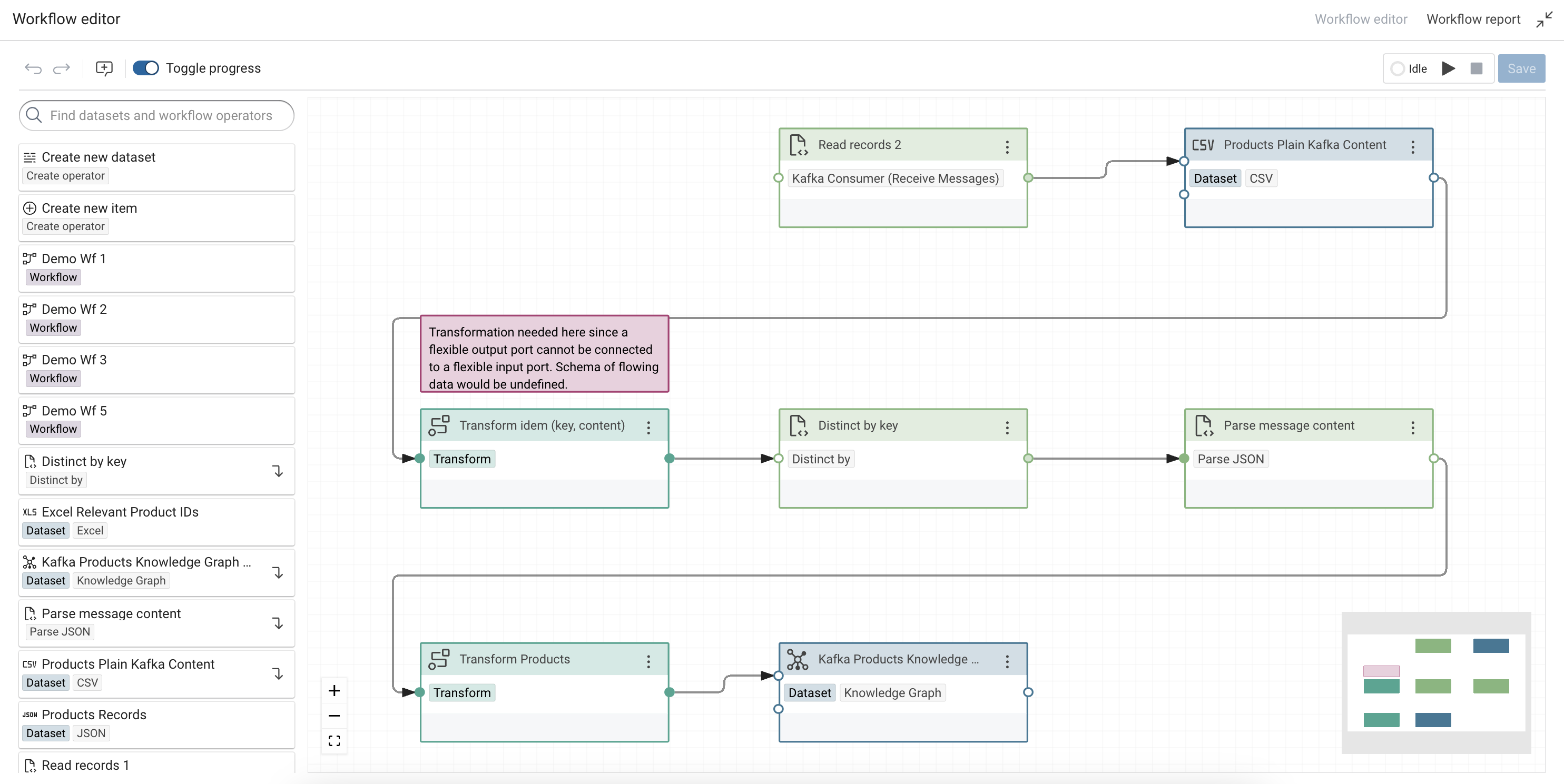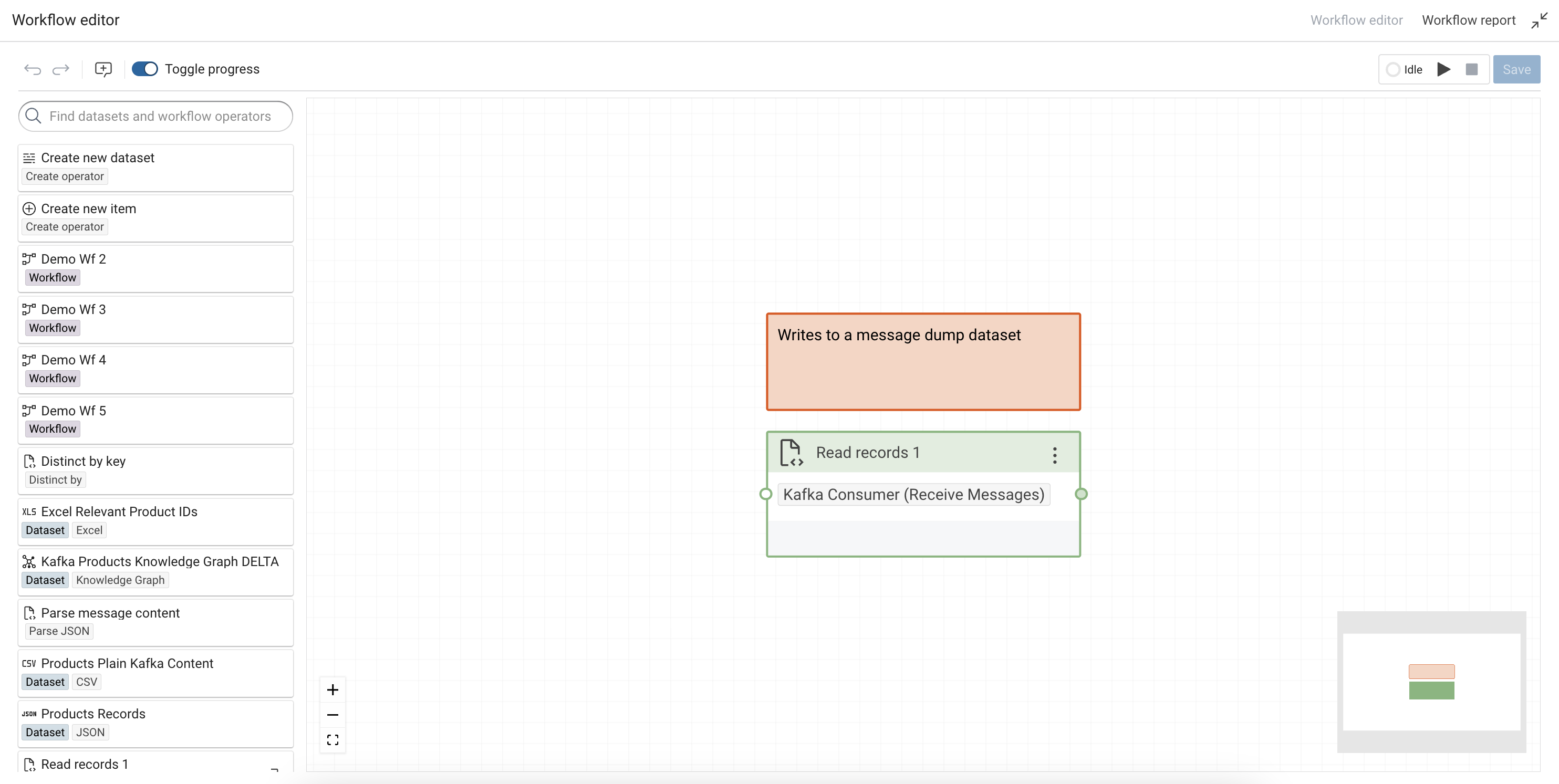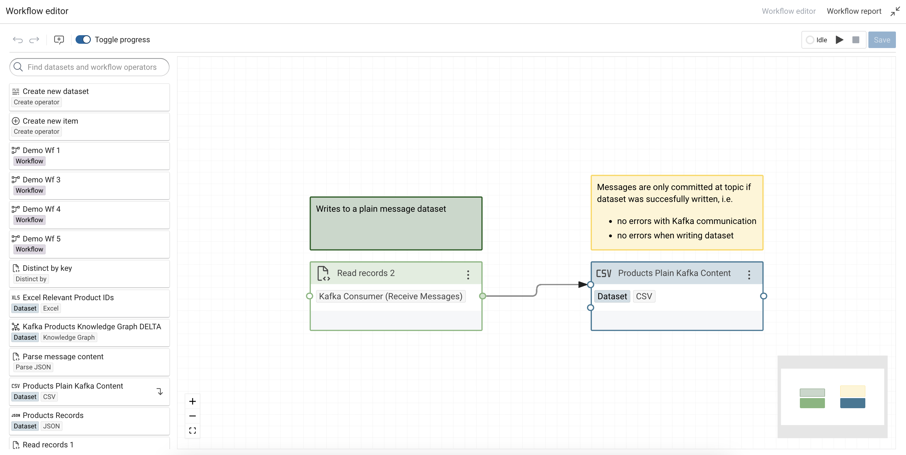 To execute the Kafka Consumer it needs to be placed inside a Workflow. The messages will be written to the dataset, which can then be used as a source for further processing.