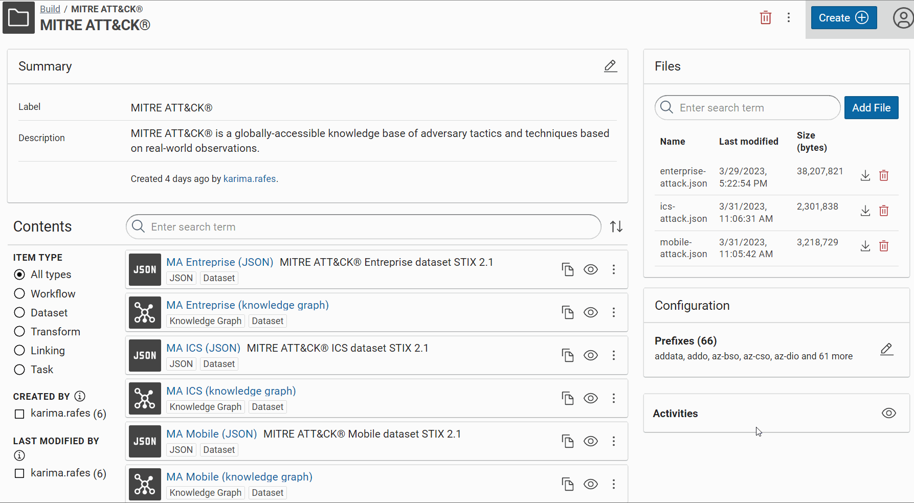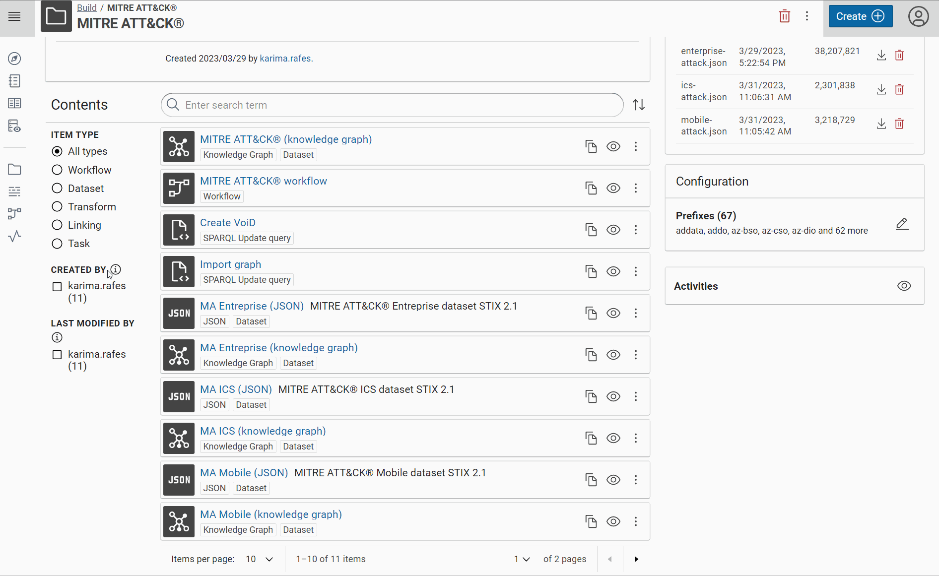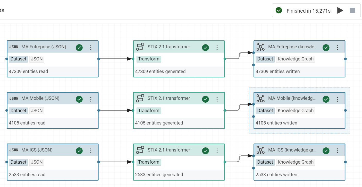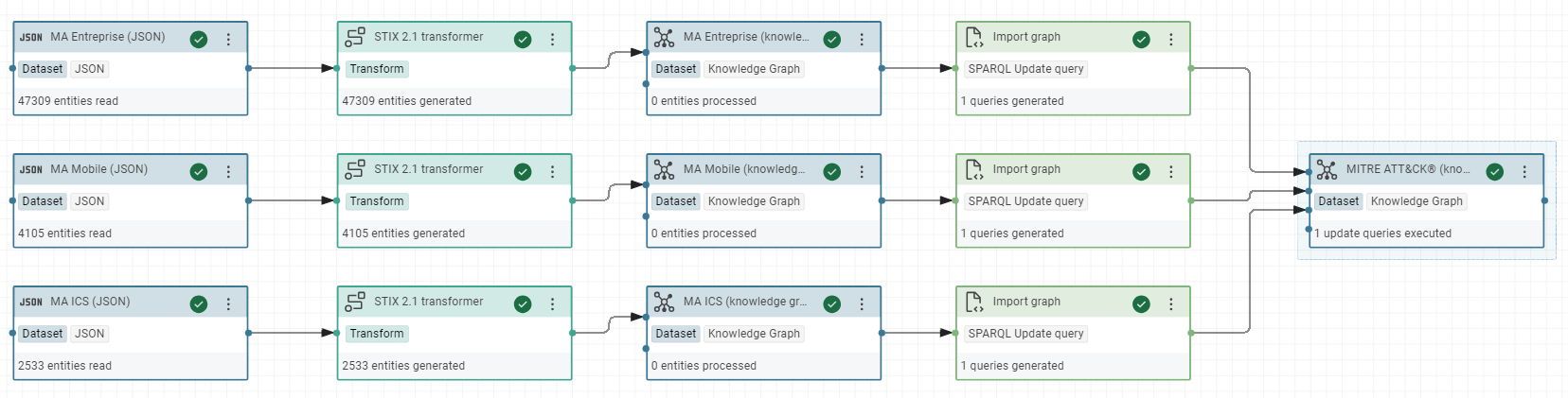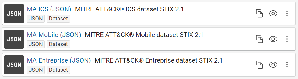 Give a short name at each dataset/transformer/etc in Corporate Memory to recognize it easily in the workflow view. For example, we will use “MA Entreprise (JSON)” like label and “MITRE ATT&CK® Entreprise dataset STIX 2.1” like description for the Entreprise dataset and so “MA Mobile (JSON)” for Mobile, “MA ICS (JSON)” for ICS, etc.