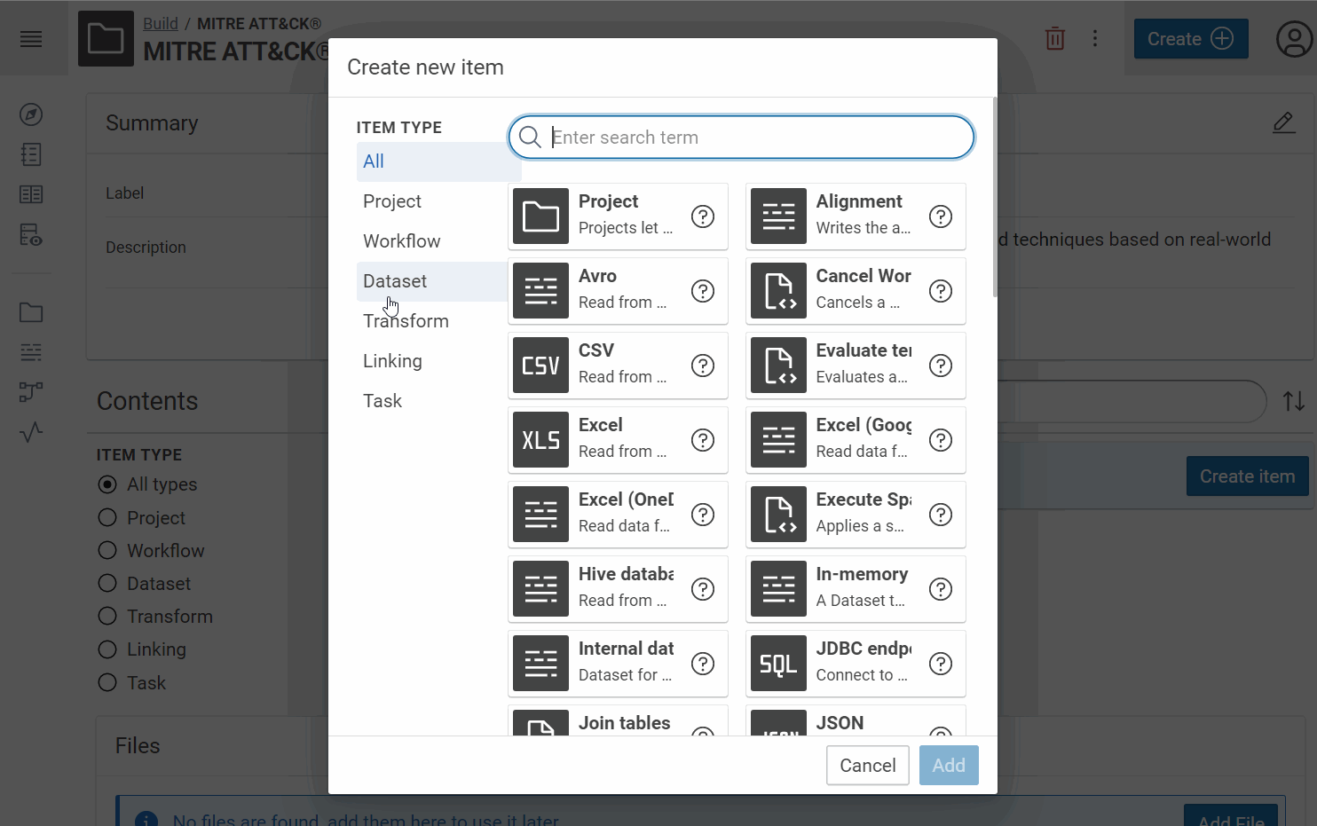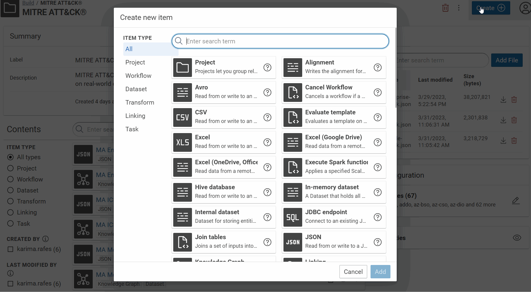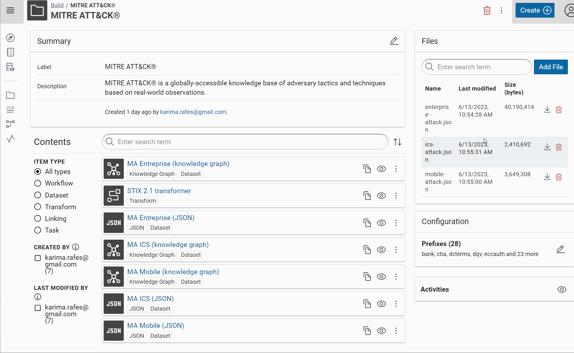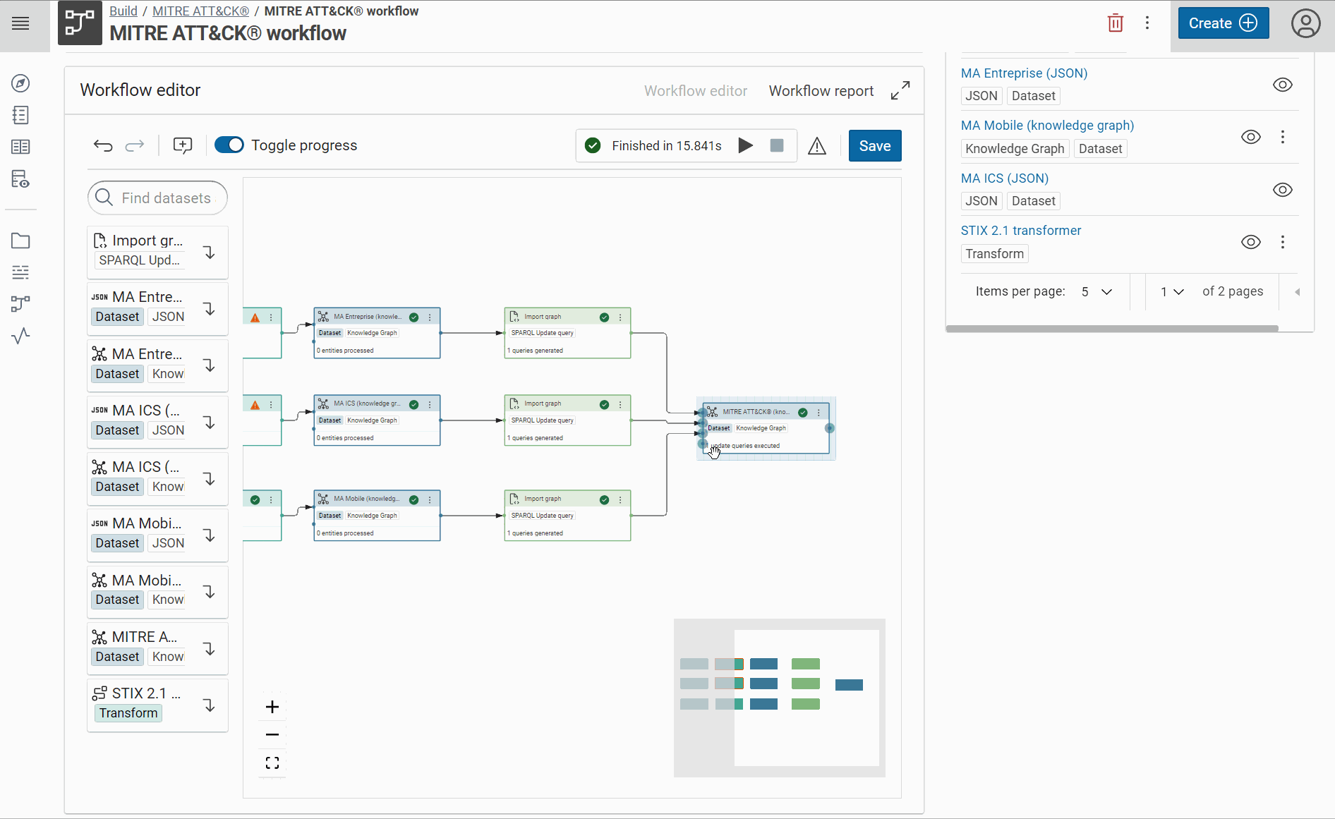 Give a short name at each dataset/transformer/etc in Corporate Memory to recognize it easily in the workflow view. For example, we will use “MA Entreprise (JSON)” like label and “MITRE ATT&CK® Entreprise dataset STIX 2.1” like description for the Entreprise dataset and so “MA Mobile (JSON)” for Mobile, “MA ICS (JSON)” for ICS, etc.