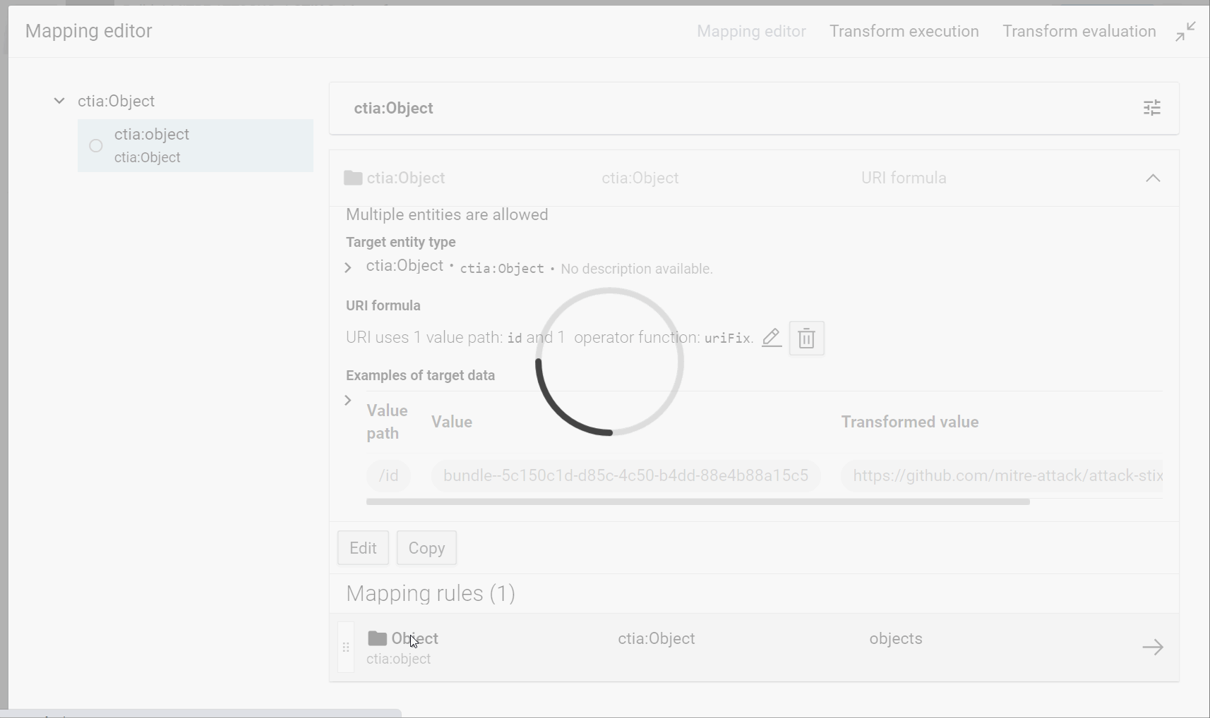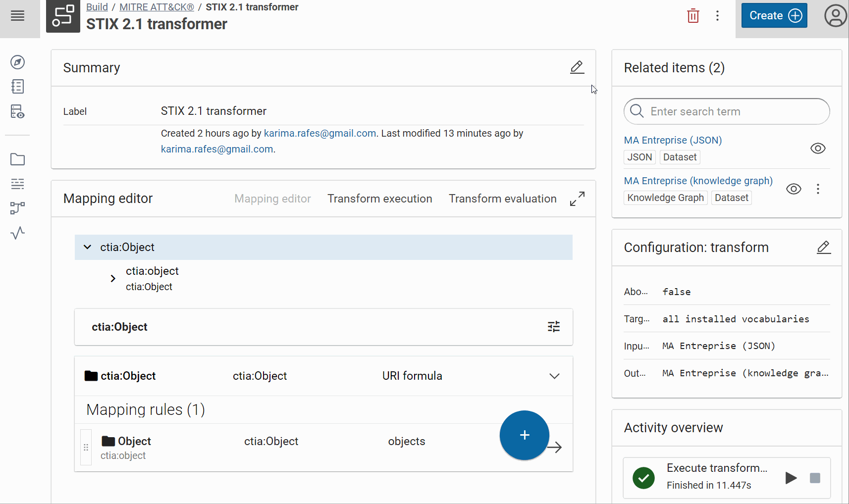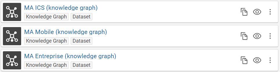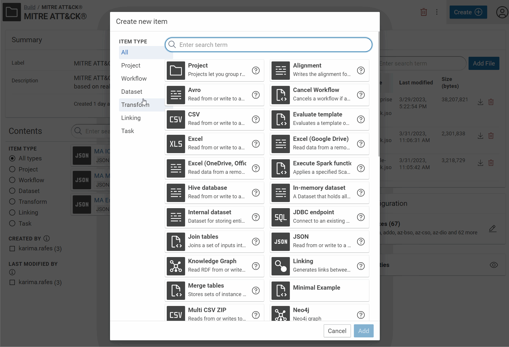 Give a short name at each dataset/transformer/etc in Corporate Memory to recognize it easily in the workflow view. For example, we will use “MA Entreprise (JSON)” like label and “MITRE ATT&CK® Entreprise dataset STIX 2.1” like description for the Entreprise dataset and so “MA Mobile (JSON)” for Mobile, “MA ICS (JSON)” for ICS, etc.