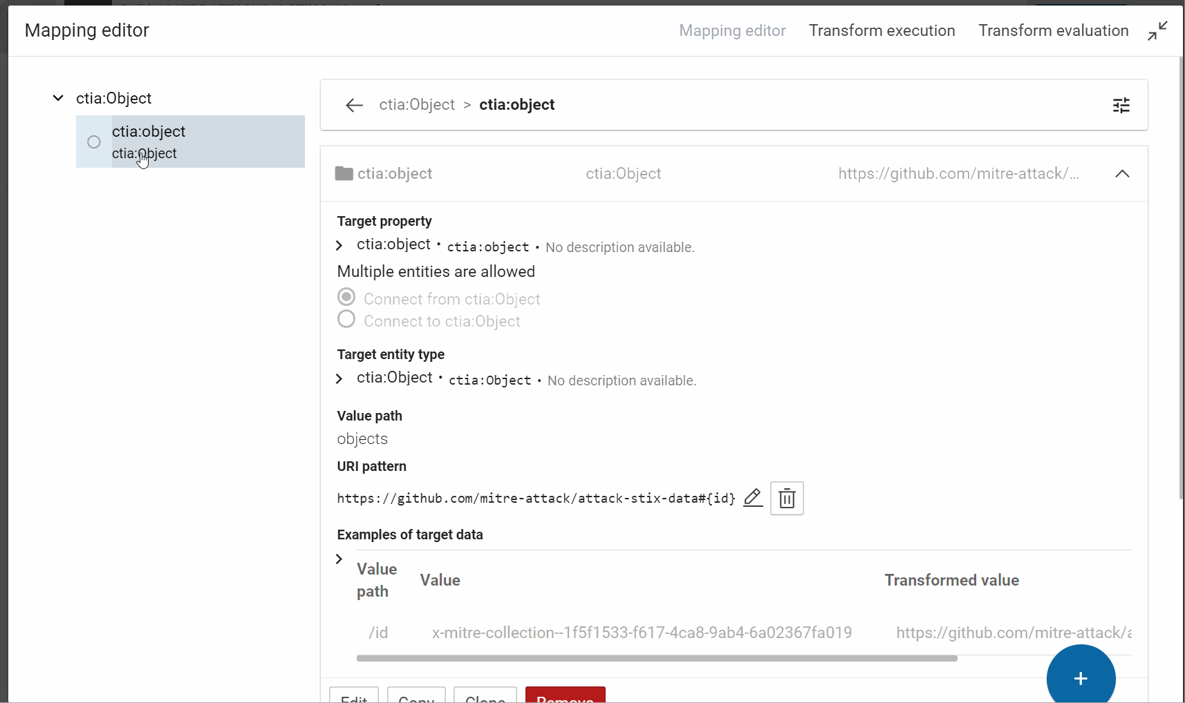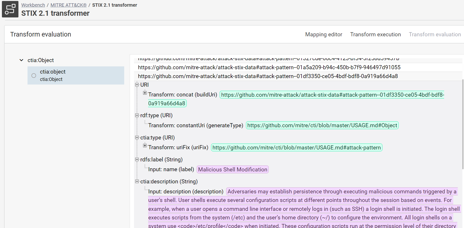STIX uses JSON syntax and can therefore be converted to RDF via Corporate Memory. Here, we have only extracted a few useful fields for our use case but if you want to import all the data, you will need to import the other properties from STIX 2.1, the extended properties in your Mitre datasets and convert the other STIX relationships to RDF statements (like in the exercice “Create inferences”).