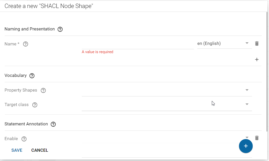 (Edit). A form is shown to you with input fields Name, Property Shapes, Vocabulary, Target class and Statement Annotation. The initial definition requires the name, and the target class. Fields are attached to the form later. Target class in particular binds the form to the resources it should cover. The Target class field features an auto-complete that displays all classes stored in Corporate Memory. The example form should cover resources of the type foaf:Person, so enter foaf:Person in the Target class field. Click SAVE to save the NodeShape.