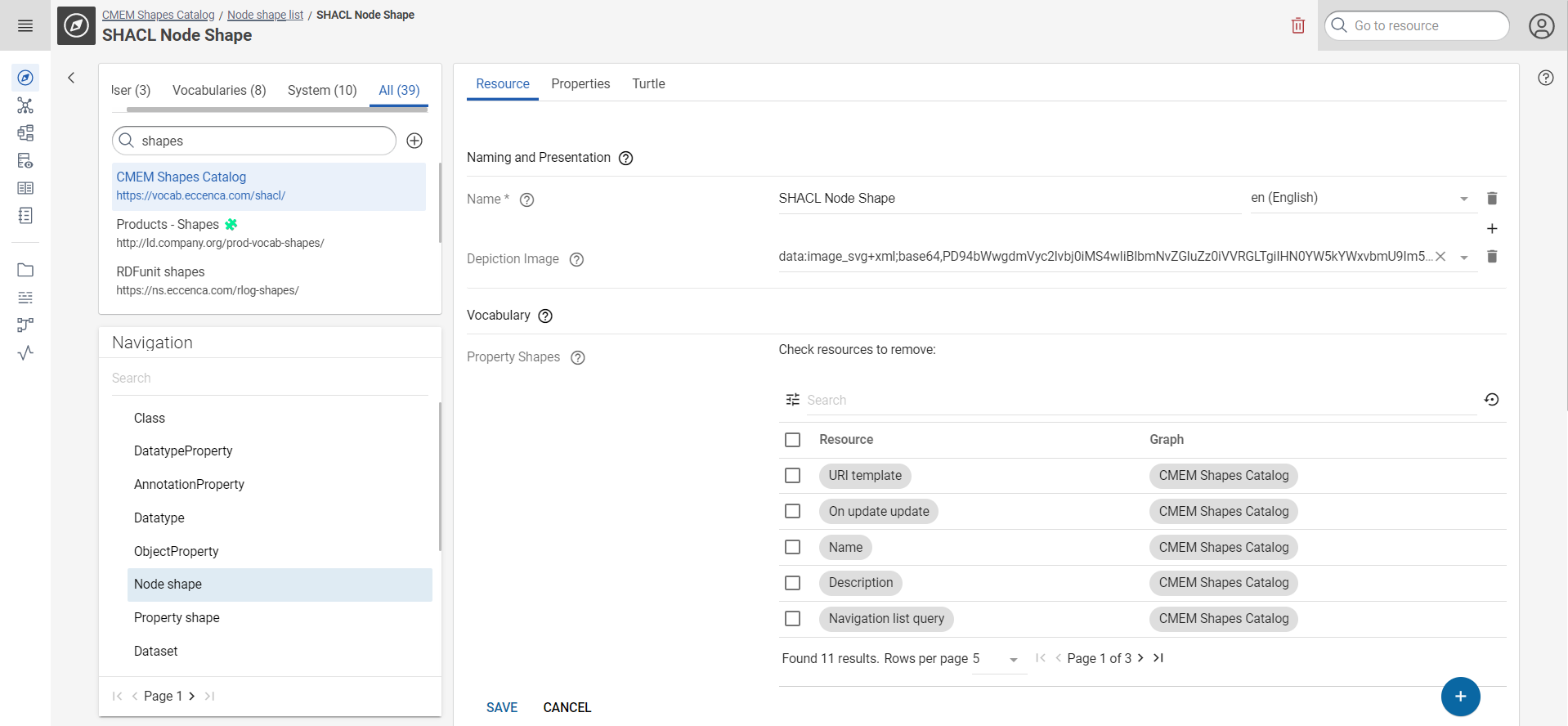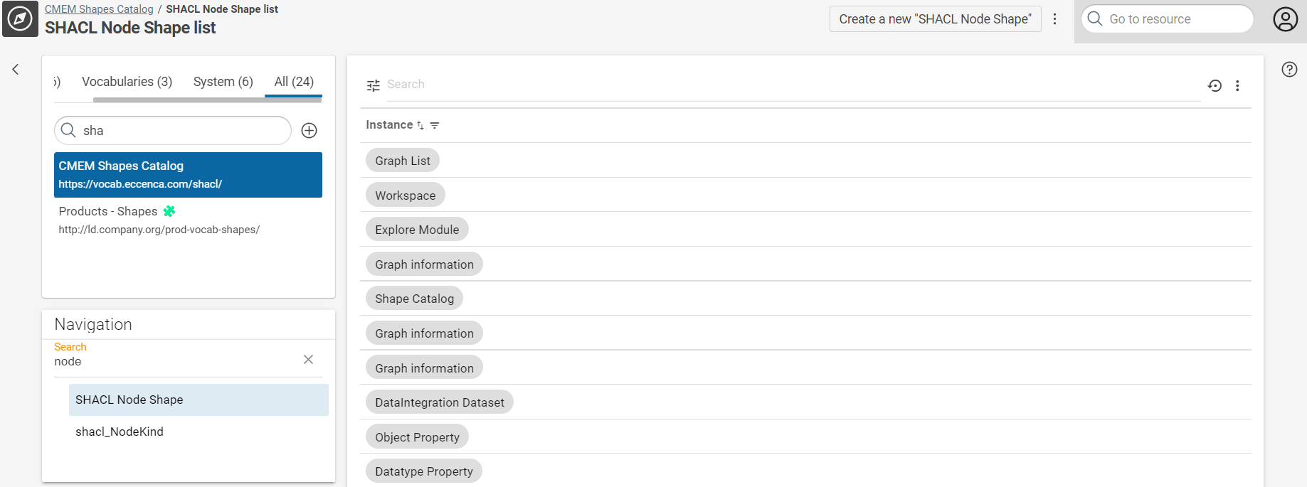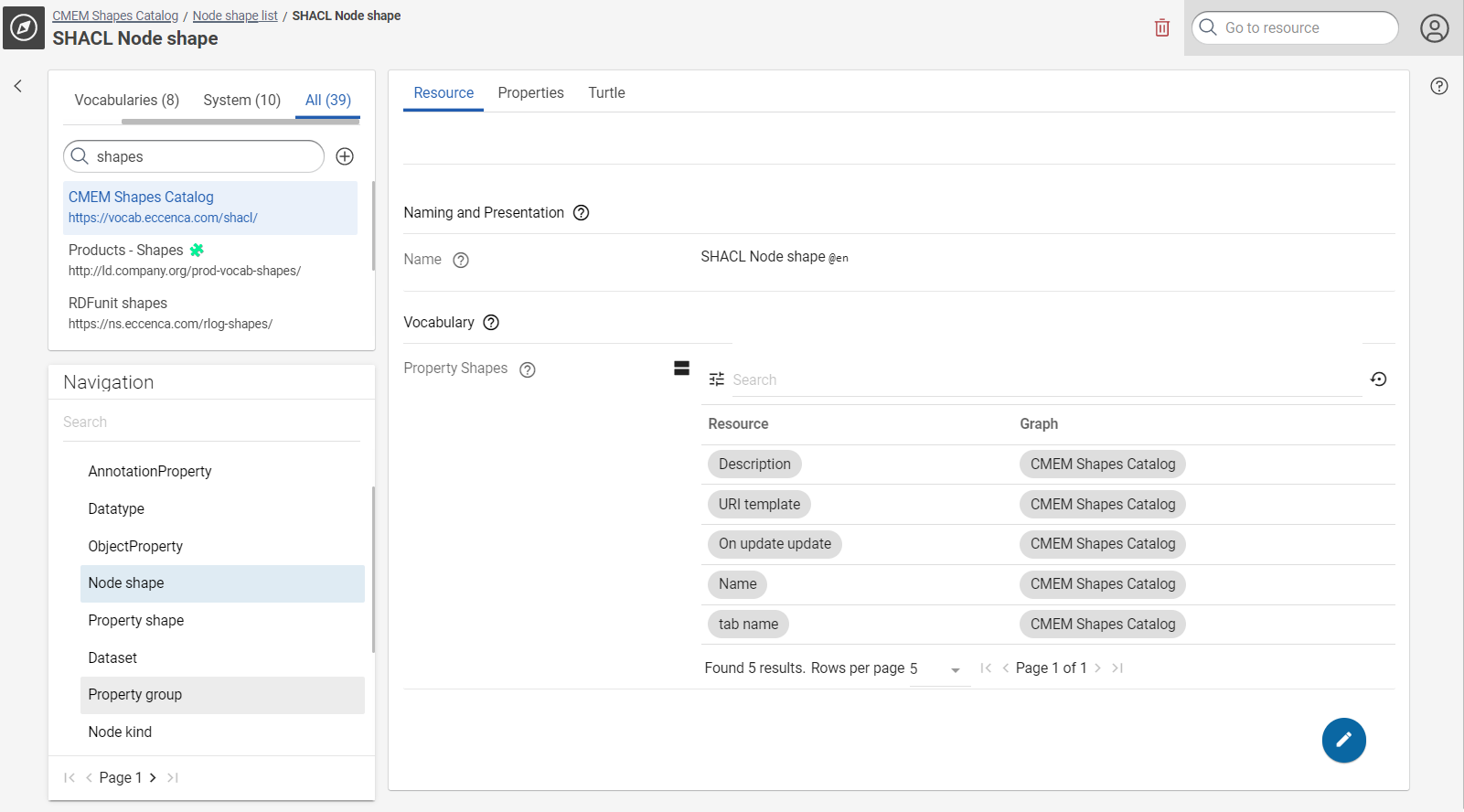 To define a new form, for example for foaf:Person resources, navigate to the CMEM Shapes Catalog graph and select NodeShape in Navigation. The list of existing NodeShapes is shown. Click “Create a new SHACL Node shape” in the upper right to create a new NodeShape. Enter a name of the resource. An empty NodeShape resource is created and shown.