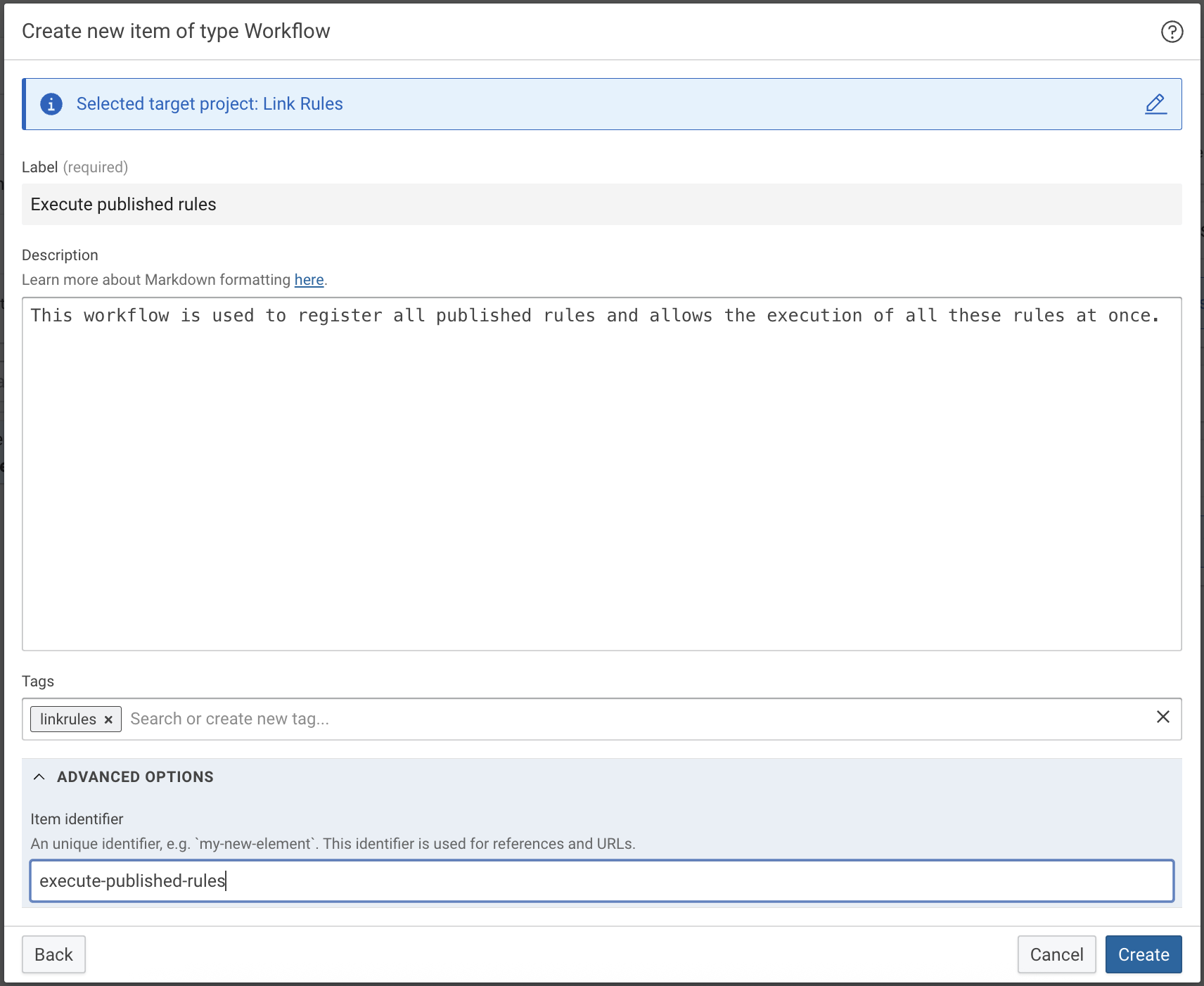 CMEM Access Conditionsgraph to find theAccess Conditionrule and its respective IRI. - Published Rules Workflow ID: The Item Identifier of the workflow in the Link Rules Build project we just created.
